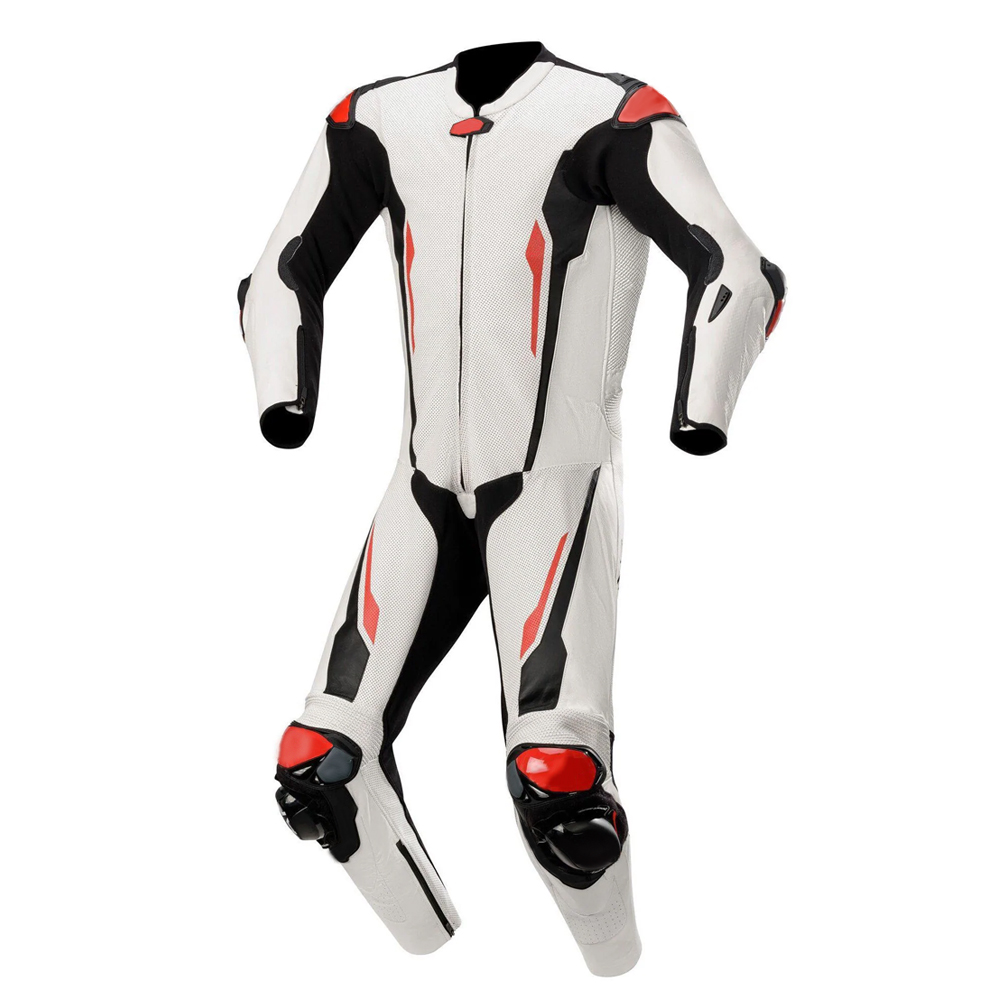 A motorbike leather suit is a durable, protective outfit made from high-quality leather, designed to offer abrasion resistance and flexibility. It features reinforced areas for safety, ventilation for airflow, and optional armor inserts for added protection. The sleek design provides both comfort and style for riders.
